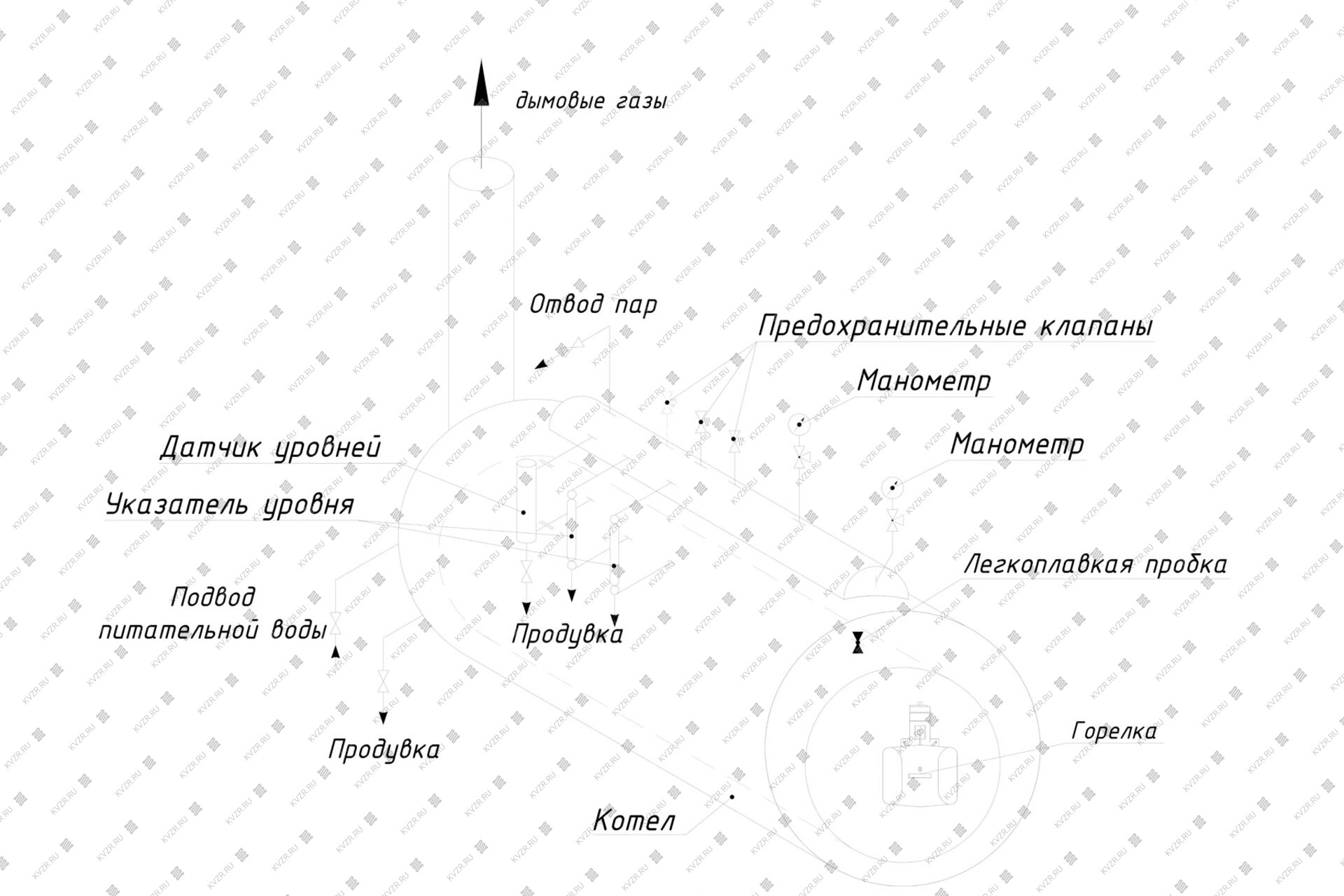 Теплообменник изготавливается из двух стальных цилиндров разного диаметра, вставленных один в другой и соединенных между собой фланцами и конвективными трубами. В верхней части теплообменника приварен паросборник, представляющий собой полуцилиндр. Конвективный трубный пучок соединяет верхнюю и нижнюю часть водяной рубашки котла, пар образуется при испарении нагреваемой воды и собирается в паросборной камере, далее через паропровод направляется потребителю на технологические нужды. Дымовые газы проходят через трубный пучок и выходят в верхней части котла. В передней части жаровой трубы размещена топка амбразурой под горелку, а в задней части - конвективный пучок труб. Топливо подается через горелку, паропроизводительность регулируется путем увеличения или уменьшения количества топлива. Температура сухого насыщенного пара низкого давления регулируется изменением давления пара, чем ниже давление пара, тем ниже температура.