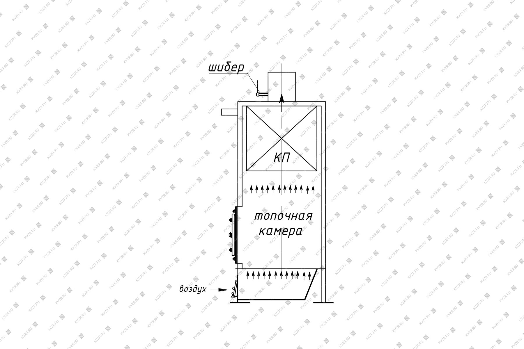 Сверху котла стоит поворотный шибер для регулировки тяги в газоходе. С помощью шиберов угольный котел КВ 0,25 на естественной тяге легко регулируется по мощности в процессе эксплуатации.