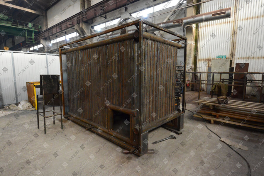 Блок водонагревательного котла КВм 4,0 МВт представляет собой горизонтальную стальную сварную конструкцию, состоящую из трубной системы (радиационной и конвективной поверхности нагрева), опорной рамы и каркаса с теплоизоляционными материалами, обшитого листовой сталью. Топочная камера состоит из труб Ø 57x4,0 мм. Конвективная поверхность нагрева состоит из пакетов выполненных из труб Ø 32x3 мм, для интенсификации теплообмена трубы пакетов расположены в шахматном порядке.