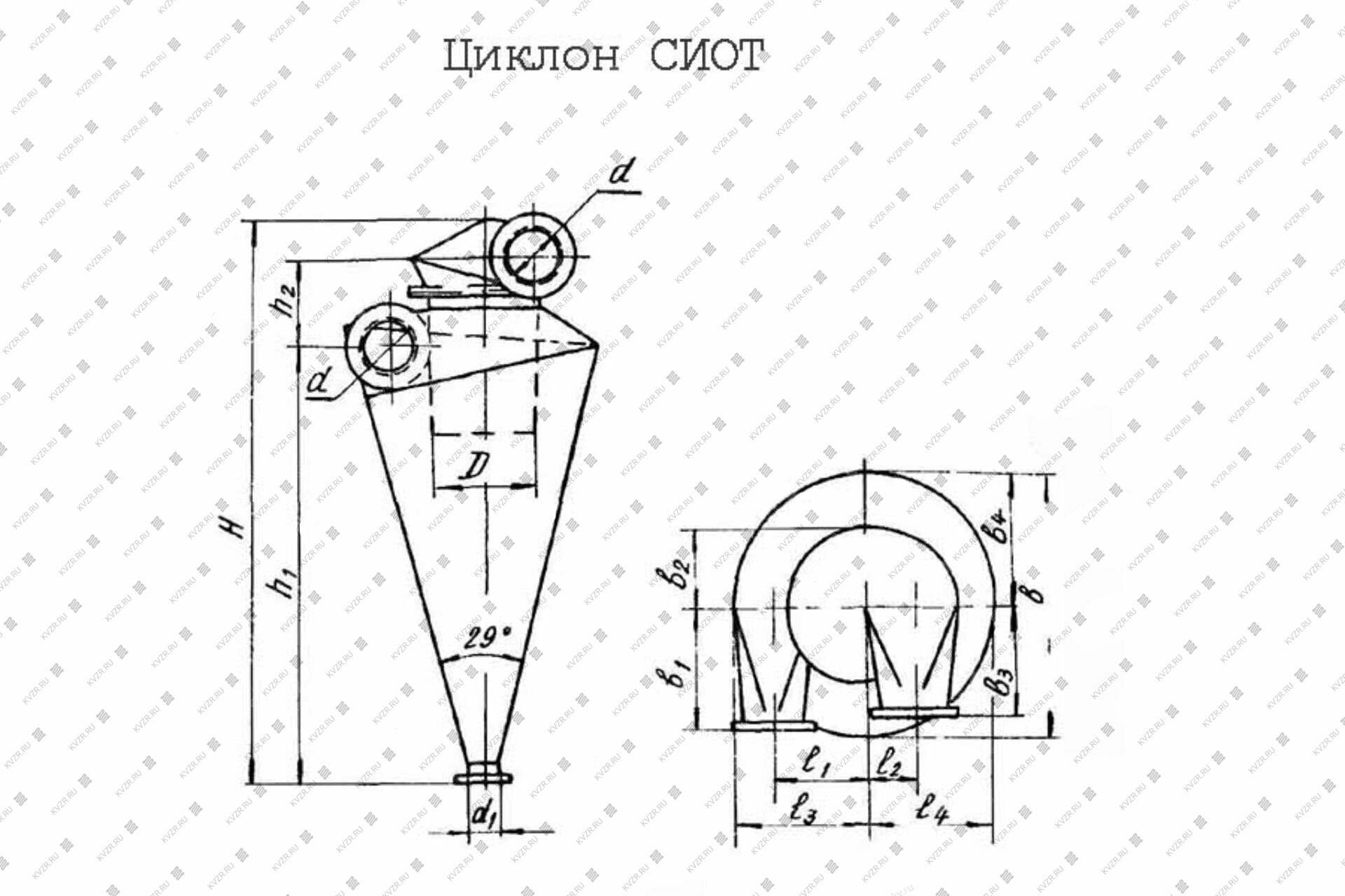 | Типоразмер циклона СИОТ | d | D | d1 | h1 | h2 | H | b1 | b2 | b3 | b4 | b | L1 | L2 | L3 | L4 |