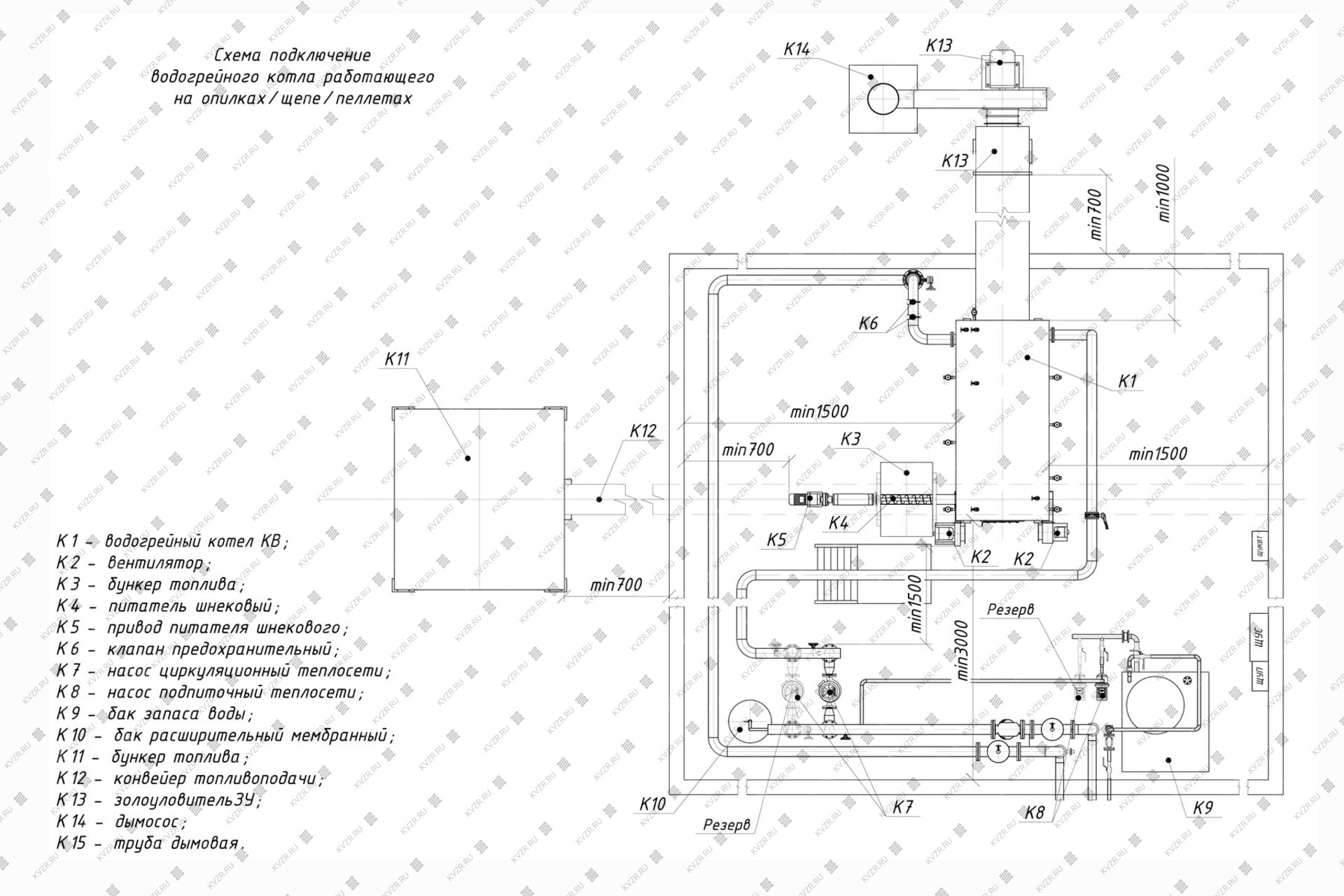 Чтобы правильно подключить пеллетный котел 0.6 МВт в котельной необходимо оставить проемы для обслуживания оборудования во время эксплуатации. На представленной здесь схеме указаны их минимальные размеры. Кроме того, в данной примерной схеме монтажа водогрейных котлов и оборудования указан перечень минимально необходимого вспомогательного оборудования для правильной работы котла.